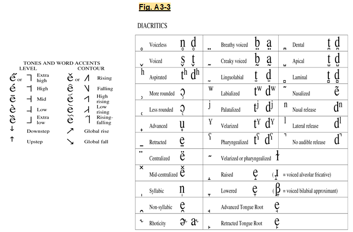 3) Too many diacritics, leading to difficult manual transcription, even when not written in cursive. Manual transcription implies pen/pencil on paper. Difficulty also implies slowness. The diacritics, etc. are further compounded by too many differentiating symbols, exponents, etc. These features of the IPA are seen in the summary of IPA diacritics presented in Fig. A3-3 below. In particular, the diacritics and accents used for tones, as shown below, are especially confusing.